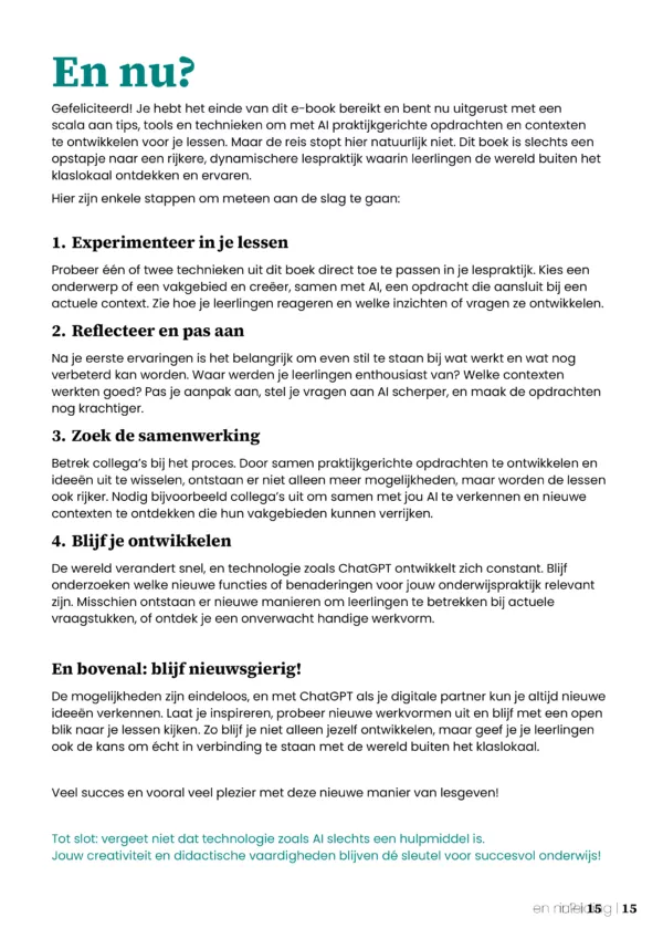 In dit e-book bieden we docenten praktische handvatten en voorbeeldprompts om direct aan de slag te gaan met AI in de klas. Met opdrachten zoals het opstellen van een stappenplan voor praktijkopdrachten, het toevoegen van context aan vakken en het verkrijgen van inzichten in beroepen, biedt dit boek een bron aan waardevolle tools voor een interactieve en realistische leeromgeving.