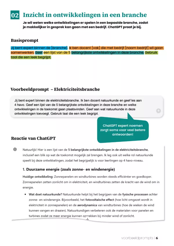 In dit e-book bieden we docenten praktische handvatten en voorbeeldprompts om direct aan de slag te gaan met AI in de klas. Met inspirerende opdrachten zoals het opstellen van een stappenplan voor praktijkopdrachten, het toevoegen van context aan vakken en het verkrijgen van inzichten in beroepen, biedt dit boek een bron aan waardevolle tools voor een interactieve en realistische leeromgeving.