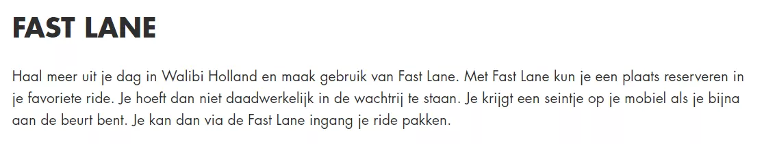 Bij andere pretparken, zoals Walibi kun je niet-wacht pasjes kopen aan de kassa. Met zo’n pasje kom je in een andere rij en hoef je minder lang te wachten.
